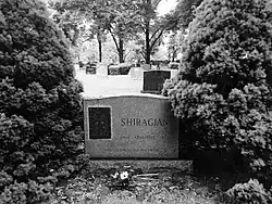 Arshavir Shirakian eventually married his wife Kayane and moved to New York in 1923, where they had a daughter, Sonia. He also was active in public life in the New York/New Jersey area and its Armenian community. He published his memoirs in 1965 entitled Ktakn er Nahataknerun (translated in English as It Was the Legacy of the Martyrs). The memoirs were eventually translated into French (La dette du sang, 1982 and 1984), English (The Legacy, 1976, by Sonia Shiragian) and Italian (Condannato A Uccidere: Memorie di un Patriota Armeno, 2005, by Vasken Pambakian).[9] A resident of Leonia, Shirakian died in 1973 at the age of 73 at Englewood Hospital in Englewood, New Jersey.[2][10] He is buried in the Hackensack Cemetery in New Jersey. He is recognized and honored as a national hero by Armenians.[11] His daughter Sonia, died in Florence, South Carolina where she is buried with her husband. She is survived by three children: Elizabeth Poston, Melineh Verma, and Arshavir Blackwell.