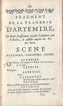 After being withdrawn from the public theatre, Artémire had seven further performances by request of the Regent's mother Elizabeth Charlotte, Madame Palatine.[4][6] The literary review L'Europe savante reported the play had had few performances, and that it contained the same weaknesses and favourable points as Voltaire's first tragedy Oedipe though it failed where Oedipe had succeeded.[7] Voltaire reused some of the material from Artémire in his 1724 play Hérode et Mariamne.[8]