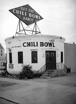 Art Whizin (1906–1994) was a former amateur boxer who established the Chili Bowl restaurant chain in Los Angeles in 1931, known for its distinctive shape in the form of a chili bowl.[1] Whizin was a 25-year-old when he established the business on Crenshaw Boulevard near Jefferson Boulevard with funding raised by selling "his wife's wedding ring and his roadster." Other businesses at the time were also modeled with architecture featuring eye-catching architectural depictions of the goods sold including ice a cream cones and coffee kettles.[1]