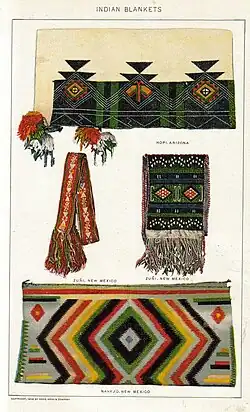 Illustration of a reversed-embroidered Hopi manta, Zuni woven sash, and Navajo loom woven blanket