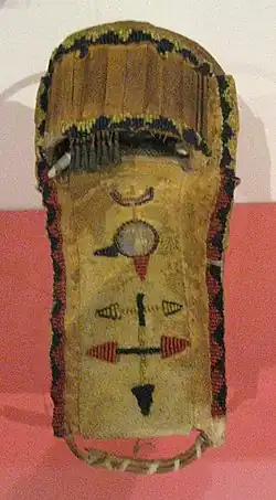 Apache saddlebag made from brain-tanned deerhide on red wool, Oklahoma Historical Society