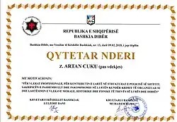 Honorary Citizen of Dibër Artan Cuku - ^ ""Nderi i Qarkut Dibër" për heroin e atdheut Artan Cuku" ["Honor of Dibër District" for the hero of the homeland Artan Cuku]. gazetabulqiza (in Albanian). 19 September 2019. p. 1. Retrieved 19 September 2019.
