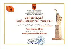 Artan Cuku Medal of Honor Certificate - ^ "Medalje Nderi pas vdekjes për Artan Cukun" [Posthumous Medal of Honor for Artan Cuku]. TV Klan (in Albanian). 14 June 2017. p. 1. Retrieved 14 June 2017.