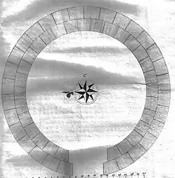 The O'on was built of dressed freestones which were not mortised into each other and no mortar was used. Each stone had a lewis hole in it to allow secure lifting with a hinged pair of metal callipers.[11] In appearance the O'on was shaped like a beehive, being circular on plan with a domed roof.[12] The perpendicular height, from the bottom to the top of the aperture, was 22 feet (6.7 m); the external circumference at the base, 88 ft (26.8 m); internal circumference, 61 ft (18.6 m); external diameter at the base, 28 ft (8.5 m); internal diameter, 19 ft 6 in (5.94 m); circumference of the aperture, 86 ft 1 in (26.24 m); diameter of the aperture, 11 ft 6 in (3.51 m); height of the door from its basis to the top of the arch 9 ft (2.7 m); breadth of the East facing door at the base, 6 ft (1.8 m); height, from the ground to the top of the key-stone of the door, 10 ft 6 in (3.20 m); breadth of the wall at the base, measuring at the door, 4 ft 3 in (1.30 m); thickness of the wall where the arch springs, 3 ft 7 in (1.09 m); and height of the basement on which the building stands, 4 ft 6 in (1.37 m).[13] The door is said to have had an iron gate, the removal of which by the Monteiths of Cars brought a curse upon the family.