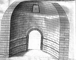 The first record is in the 9th century by Nennius, a Welsh historian, in his Historia Brittonum.[4] He was a monk studying under Bishop Elfodd, and gave a brief description of the building, and asserted, without hesitation, that it was erected by the usurper Carausius, who assumed the purple in Britain in the year 284. He also mentioned that a triumphal arch was built near it, in honour of the same individual.[16] It is shown on Timothy Pont's map, on that of John Adair and of Sir Robert Sibbald, who in the 16th century recorded it as a 'temple'.[25] In 1723 it was described as being "in the form of a sugar loaf" in an account of Larbert parish, which adjoins Stenhousemuir.[4] In 1719 Andrews Jelfe, an architect, visited and made careful drawings and measurements on behalf of the antiquarian William Stukeley, which were later published as part of a treatise on the O'on.[26]