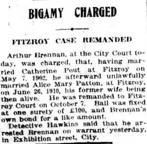 Arrested on 29 September 1914, Brennan was committed for trial on 7 October 1914,[10] on a charge of having committed bigamy.[11]