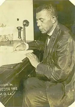 In the 1920s, Bedou opened his own photography studio in New Orleans, where he photographed everything from black families and their children to the laying of the cornerstone at Corpus Christi Church to the visits of jazz bands and celebrity speakers.[4] His photographs often appeared in both the Louisiana Weekly (a newspaper with a primarily black circulation) and the general-circulation newspaper Louisiana Times-Picayune.[4] His photographs won several awards over the years, including the gold medal at the 1907 Jamestown Tercentennial Exposition.[4]