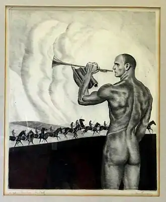 An interest in music led him to create a number of works that convey music as symbolic images. For instance, depicting Beethoven's Eroica Symphony as nude horse-backed lancers, surrounded by clouds and flanked by a trumpeter who might be Death. He also created a series based on Gustav Mahler's song cycle, "Das Lied von der Erde".