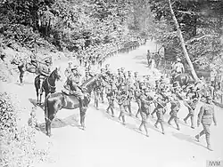 ![]() Men of the 307th Regiment, US 77th Division, (attached to the British 42nd Division for training), headed by a British regimental band, marching past Major-General Arthur Solly-Flood, GOC 42nd Division, on a road near Famechon, France, 7 June 1918. | |