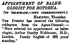 - ^ "Appointment of Balneologist for Rotorua". New Zealand Herald. 1902.