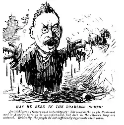 Balneology was introduced into the New Zealand political landscape in 1897. In October, during parliamentary debates on the budget, the allocation of a £1,000 line for the annual salary and expenses of a balneologist – a large sum reflecting the national importance of the function – was denounced by the opposition as a "gross extravagance".[15][18] It attracted criticism from some of the press: while the Otago Witness assumed that the term referred to the North Island's hot springs,[19] the Ohinemuri Gazette suggested that the role of a balneologist would be to show patients how to locate whales in the warm waters of Lake Rotorua;[20] the Daily Telegraph regarded the choice of the term as a form of offensiveness designed to conceal the nature of the tasks involved;[21] and the Observer suggested that, as the necessary "expertise" seemed easy to acquire, the post could easily be awarded to a local resident.[22]