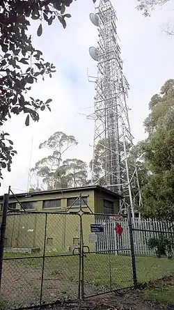 View of the physical summit of Arthurs Seat, taken from the location of the proposed Chairlift Summit station. This is the Telstra Arthurs Seat Radio Terminal which was built in the mid-1950s by the Post Master Generals Department (PMG) to link Melbourne with the Geelong Region and Mornington Peninsula. It is still used for mobile phone, emergency services and other radio communications.