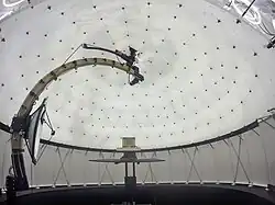 - Slovak Academy of Sciences, Bratislava, Slovakia, the facility built a flexible reflecting dome in the Institute of Construction and Architecture 1973.[11] The 8m diameter hemispherical artificial sky is fully adjustable to uniform and non-uniform overcast skies with an artificial Sun, a parabolic mirror of diameter 1.2m.[11] The artificial sky is a tubular construction that consists of gypsum plaster on metal mesh and designed on a circular ‘horizon’ tube suspended from the ceiling of the laboratory like a large white chandelier.[11] Lawrence Berkeley Laboratory, California, USA, built the 7.32m diameter reflecting dome in 1981 which was designed to replicate a uniform sky, an overcast sky and various clear-sky luminance distributions.[1] The sun simulator of diameter 1.5 m is used.[12] The metal dome was kept at a height of a seven-foot-high cylindrical plywood wall which enables large models to be transferred in and out through the large doors.[12] The reflectivity of up to 80% is achievable due to high-reflectance white paint sprayed on the interiors.[12] The illumination system of high-output fluorescent lamps and ballasts provides an illumination level of around 5000 lx for a uniform sky, 3500 lx for the overcast sky and more than 6000 lx for a regular clear sky.[12] Large architectural scale models of up to 6 feet across can be accommodated with the ability of the whole platform to rotate.[12]