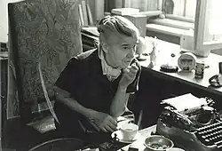 The writer is the protagonist in the third part of the novel and influences the development of the first-person narrator as a writer in a field of tension contrasted with Brecht. Her last months in Alingsås and her suicide are also depicted.