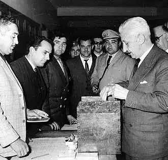 With 99 of the 192 seats in Argentina's Chamber of Deputies up for re-election in March 1965, Illia permitted Peronists under the Unión Popular party to participate in federal elections for the first time since 1954. Illia also tolerated a Peronist political rally two nights before the election.[35] The Union Popular won 31% of the vote with various neo-Peronist candidates winning an additional 7%. The strong Peronist electoral performance emboldened Illia's critics who were concerned that he would allow the Peronist party, or even Peron himself, to participate in the 1969 Presidential election.