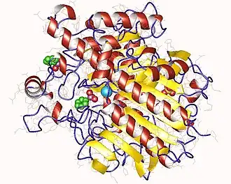 Arylsulfatase (EC 3.1.6.1, sulfatase, nitrocatechol sulfatase, phenolsulfatase, phenylsulfatase, p-nitrophenyl sulfatase, arylsulfohydrolase, 4-methylumbelliferyl sulfatase, estrogen sulfatase) is a type of sulfatase enzyme with systematic name aryl-sulfate sulfohydrolase.[1][2][3][4] This enzyme catalyses the following chemical reaction