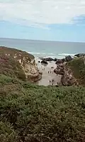 At low tide, there is access to a sand deposit delimited by a rocky wall made from slate and schist forming 30 metre arches resembling cathedral flying buttresses, large caves, sand corridors between rocky blocks, and other geological features. Particularly low tides create access to nearby beaches through the sand extension. As the coast stretch is almost horizontal, the water covers the beach again very quickly.