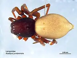 - ^ a b Gloor, Daniel; Nentwig, Wolfgang; Blick, Theo; Kropf, Christian (2019). "Gen. Asadipus Simon, 1897". World Spider Catalog Version 20.0. Natural History Museum Bern. doi:10.24436/2. Retrieved 2019-06-12.