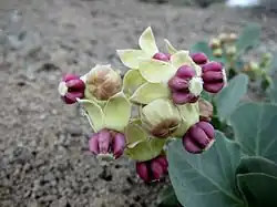 Asclepias cryptoceras is a species of milkweed known by the common names jewel milkweed,[1] pallid milkweed, Humboldt Mountains milkweed, and cow-cabbage.[2] It is native to the Great Basin of western North America, where it grows in many types of habitat, especially dry areas.[3] This is a perennial herb growing low against the ground or drooping. It arises from a fleshy, woody rhizome-like root. The thick leaves are round to heart-shaped and arranged oppositely on the short stem. The inflorescence is a cluster of small flowers with centers of bright to dull pink hoods surrounded by pale-colored reflexed corollas. The fruit is a follicle held erect on a small stalk.