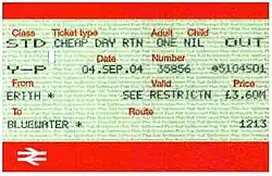 The tickets have orange bands at the top and bottom, in common with the stock used for travel tickets in other British railway ticket issuing systems. In British Rail days, they were identified by batch reference BR 3595/3; this changed to RSP 3595/3 after privatisation, following the creation of Rail Settlement Plan Ltd to administer the ticketing and revenue allocation systems of the post-privatisation rail network. Machines on the South West Trains network sometimes use stock with reference RSP 3595/30; a VAT number is printed on the reverse of these, above the batch reference.