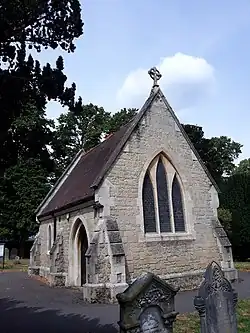 The first meeting of the Board took place shortly after on 19 November 1886 in the School Room at Ash when the Reverend Walsh was elected Chairman. One acre 2 rods and 4 perches (now sections A to F of the cemetery)[3] for the cemetery were bought in 1887 from the landowner, Winchester College, for £152 10s.[1] This land was then cleared and trees planted and footpaths and fencing laid. The cemetery opened in July 1888 with the first funeral said to have been that of an unknown man who was found dead in the road outside the cemetery. The building of a cemetery chapel in 1889 cost £540 which was financed by a loan from an insurance company. The stained glass window memorial in the chapel to the Great War was the gift of local benefactor Henry Morris Chester of Poyle Park. George Manfield (1846–1908), a local farmer and the sexton of nearby St Peter's church[4] was the cemetery's first gravedigger and cemetery caretaker at a salary of £10 yearly, increased in 1903 to £15. Manfield also had the responsibility for collecting the cemetery fees and paying them to the Parish Clerk.[2]