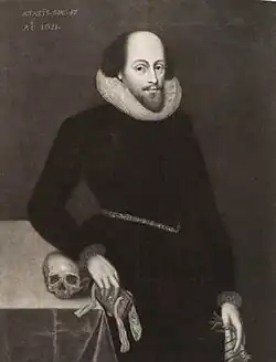 The identity of the artist is unknown.[2] At some point the portrait was altered to cater to public demand for more pictures of the bard and to conform to 19th century ideas of Shakespeare.[3] The hair over the forehead was scraped out and painted over to create a bald patch. It was also lengthened at the sides, an appearance associated with Shakespeare. The date was also altered to fit Shakespeare's age. The coat of arms was painted over. In this form the painting bore the date 1611 and purported to show Shakespeare at the age of 47.[4]