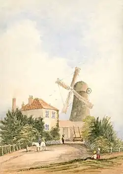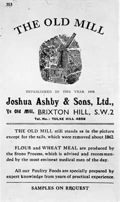 Ashby's Mill was built in 1816 and worked by wind until 1862, when the business was transferred to a watermill[4] at Mitcham[5] on the River Wandle. The sails were removed in 1864 and the windmill was relegated to use as a store.[4] In 1902, the lease on the watermill expired and a steam engine was installed in the windmill.[5] This was later replaced by a gas engine. The windmill was worked by engine until 1934, and supplied wholemeal flour to West End hotels and restaurants.