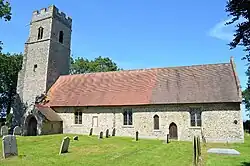 The village is situated 7+1⁄2 miles (12.1 km) south-east of Norwich and 1 mile (1.6 km) north of Thurton, with Claxton (to the north), Hellington (to the west) and Carleton St Peter (to the east) all lying a similar distance away. The church has a high tower, a long, low nave, and an impressive Norman doorway.[5] A tombstone in the graveyard depicts a husband and wife (George and Ann Basey) feeding their turkeys and geese;[6] Ann's carving is repeated on the village sign, which was commissioned in 2000 to celebrate the millennium. It also depicts a windmill which stood in the village until at least 1916.[7]
