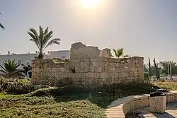 During the Crusades, as property of the lord of Ramla, Hugh, it was bequeathed to the knight Nicolas de Beroard and became known as "Castellum Beroart".[2] Its contemporary Arabic name is "Minat al-Qal'a", after the Umayyad-era fort that was built at the site and whose ruins remain partially intact to this day.[4]