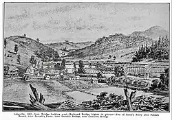 Asheville, 1883—Iron Bridge looking west—Railroad Bridge higher in picture—Site of Sams's Ferry over French Broad, later Jarrett's Ferry, later Smith's Bridge, now Concrete Bridge (1922)