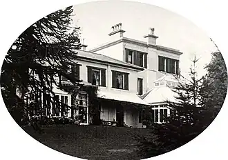 The Ordnance map[2] to the right shows Ashfield surrounded by similar villa houses, each in their own one- or two-acre gardens. Ashfield was a large early Victorian house whose entrance carriage drive ran from Barton Road not far from the Blue Plaque. It wound through the front garden up to the house. The photo of the house above is from the back, showing the external glass conservatory on the right. This conservatory is marked on the map.