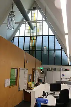 In 1977, when the Uniting Church was officially formed by the amalgamation of Methodist, Presbyterian and Congregational Churches, the Ashgrove Methodist Church became known as the Ashgrove Uniting Church.[65] In the 1990s (while the church remained in use) renovations were made to the interior including the removal of the original sanctuary and vestry. Much of the original furniture was removed and a new stained-glass window at the eastern end of the church was introduced.[1]