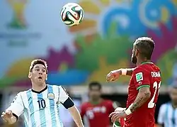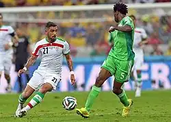 On 21 September 2011, he was invited to the Iran national team by Carlos Queiroz.[49] He scored twice on his debut for Iran against Qatar on 29 February 2012 in a World Cup qualifier.[50] Upon qualification to the 2014 World Cup, his next international goals came on 15 and 19 November in Asian Cup qualifying wins over Thailand and Lebanon, sealing Iran's place in the 2015 Asian Cup as well.[51] Dejagah was named in Iran's 2014 FIFA World Cup squad by Carlos Queiroz.[52] He started for Iran in their opening match against Nigeria, but was substituted in the 73rd minute by Alireza Jahanbakhsh. He also played 85 and 68 minutes in the next matches against Argentina and Bosnia and Herzegovina, respectively. He was called into Iran's 2015 AFC Asian Cup squad on 30 December 2014 by Carlos Queiroz.[53]