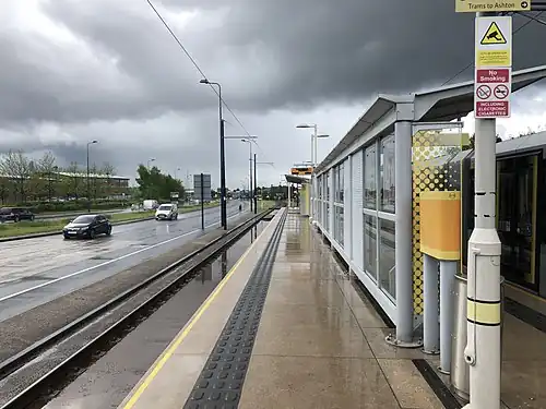 The stop is located on Lord Sheldon Way near the Ashton Moss leisure complex and Snipe Retail Park on Ashton New Road.[2] Ashton Moss tram stop is served by a Park + Ride car park, with electric vehicle parking facilities.