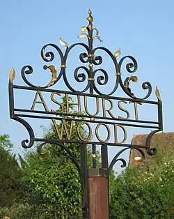 The date of when the village was formed is not known. Two of the main roads in the village and Lewes Road (now part of the A22) were used as a ridge-way track for animals and people 5,000 years ago.[5][6] There is evidence of a Roman ironworks in the village. By 1066, the area had two established farms, the tracks between them are still in use today as roads.[7] The name of Ashurst Wood dates back to 1164 when the region was known as Aesehyrst Wilde. There was no village then and the name was used for a common area.[8] During the reign of Henry II, the area that is now Ashurst Wood was called, Esseherst. The names Aisherst, Askhurst and Eseherst were in use in the years 1186, 1248 and 1279 respectively. Around 1300 a house was built, part of which remains as the Headmaster's drawing room in Stoke Brunswick School,[9] and has been designated by English Heritage as a grade II* listed building.[10] By the time of the reign of Elizabeth I, Ashurst Wood had prosperous farms, with Water Farmhouse being built in the 16th century,[11] Great Surries dating from the 17th century,[12] and its barn being slightly more recent.[13] The population grew and more houses were built in the village. in 1855, the nearby town of East Grinstead was connected to London by rail, and another rail connection to the area in 1884 meant that Ashurst Wood was more accessible. Many wealthy people bought property in the area and this provided work other than that of the agricultural type.[14]
