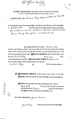 Patent of Richard Stage Jr. for ownership of land in modern day Ashville, Ohio.