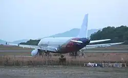Asiana Airlines Flight 162 was a regular short-haul international passenger flight from Incheon International Airport near Seoul, South Korea, to Hiroshima Airport in Hiroshima, Japan.[1] On 14 April 2015, the Airbus A320-232 aircraft touched down short of the runway, struck the localizer array, skidded onto the runway on its tail, and spun 120 degrees before finally coming to a rest on the grass, opposite the terminal building. The aircraft suffered substantial damage to the left wing and engine. Of the 82 people aboard, 27 occupants (25 passengers and 2 crew) were injured, one seriously.[2][3][4]