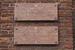 tWO plaqueS commemorate Frits-Johan Blichfeldt Møller and Hans Jørgen Henry Christiansen. two members of the Danish resistance movement, who were shot on the site by the Germans during World War II.[5]