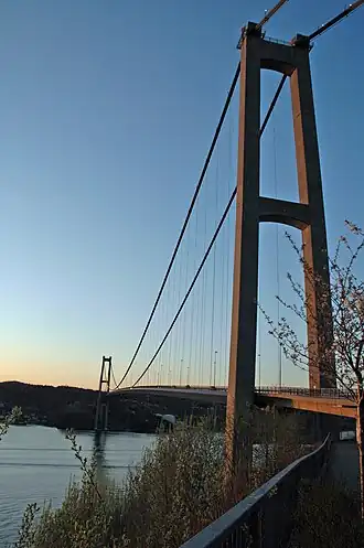 There are two main cables, one on each side, which consist of twenty locked coil cables in a seven wide and three tall matrix. Each strand has a diameter of 99 millimeters (3.9 in). The cable has a quality of 1,570 megapascals.[1] Each coil, which consists of 289 wires, can tolerate at least 9,060 kilonewtons (2,040,000 lbf) and weighs 71 tonnes (70 long tons; 78 short tons). The cables are anchored in rock 35 meters (115 ft) below the road level.[3] The main span's sag-to-span ratio is 1:10.[1] The bridge has a 200-meter (660 ft) wide clearance below of 62 meters (203 ft).[3] The bridge carries two lanes of County Road 562 across Byfjorden, between Storeklubben in Askøy and Brøstaneset in Bergen.[4] In 2010, the bridge had the daily average traffic of 17,251 vehicles.[2]