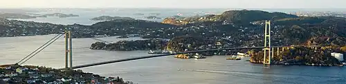The Askøy Bridge (Norwegian: Askøybroen) is a suspension bridge that crosses the Byfjorden between the municipalities of Bergen and Askøy in Vestland county, Norway. It is 1,057 meters (3,468 ft) long and has a main span of 850 meters (2,789 ft). Its span was the longest for any suspension bridge in Norway, until the Hardanger Bridge, also in Vestland, opened in August 2013. Now the bridge is the third longest in Norway. It carries two lanes of County Road 562 and a combined pedestrian and bicycle path. The bridge's two concrete pylons are 152 meters (499 ft) tall and are located at Brøstadneset in Bergen municipality (on the Bergen Peninsula of the mainland) and Storeklubben in Askøy municipality (on the island of Askøy). The bridge has seven spans in total, although all but the main span are concrete viaducts. The bridge has a clearance below of 62 meters (203 ft).