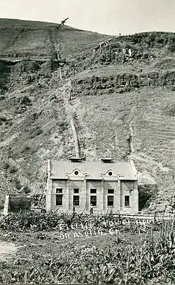 In 1906 the Washington Water Power Company built a diversion dam and hydroelectric plant on Asotin Creek. Water was diverted from Asotin Creek through a 7-mile (11 km) long wooden pipeline to a 3000-horsepower generating station located just above the creek's mouth. The outflow was then channeled to a second, smaller powerhouse above Clarkston. In addition to a small steam plant in Lewiston, the Asotin hydroelectric system met the early power needs of the whole region spanning from Lewiston, Clarkston, Asotin, Genesee and Moscow.[22] The hydroelectric system was abandoned sometime before 1935, when it was noted that "no water has been diverted for power for many years", but the pipeline was still being used for water supply.[16] The disused Asotin generating station still exists today and is located about 1 mile (1.6 km) upstream of Asotin.[23]