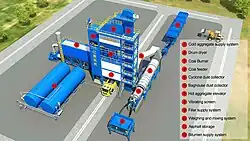 An asphalt plant or asphalt mixing plant is a structure which mixes aggregates and bitumen into asphalt at the required temperature. They are widely used for the construction of highways, city roads and parking lots.