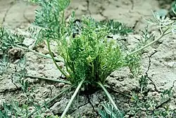 Characteristic symptoms specific to the carrot include initial vein clearing and chlorosis, followed by the production of many adventitious shoots, with the tops looking like a witches’-broom. The internodes of such shoots are short, as are the leaf petioles. Young leaves are smaller and dry up, while the petioles of older leaves twist and break off. Any remaining older leaves turn bronze or red late in the season. Floral parts are deformed, and roots are smaller, abnormally shaped, and have woolly secondary roots. The carrot roots are predisposed to soft rots in the field and storage and taste unpleasant to the consumer.[7]