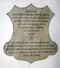 The charterhouse was founded on June 2, 1409, by Erkinger von Seinsheim[2] and his first wife, Anna von Bibra, as a place of burial for their family, a function which the monastery served for several centuries for Erkinger's descendants, the Barons and later Princes von Schwarzenberg. Erkinger, his second wife Barbara von Abensberg, and Anna's sons Michael and Hermann renewed and confirmed the charterhouse in 1434.