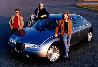 ![]() The 3 designers of the 1993 Lagonda Vignale with the car (l-r): Moray Callum, David Wilkie, Sally Erickson Wilson. | |