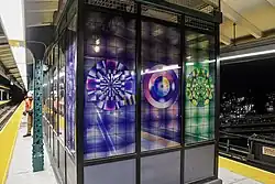 As part of the MTA Arts & Design program, Jeffrey Gibson created an artwork for the station, titled I Am A Rainbow Too (stylized in all-capital letters), which was installed in 2020.[34] The work includes over 100 laminated glass panels,[35] The artwork includes depictions of the moon, sun, and stars, which are decorated in the colors of a rainbow.[34]