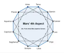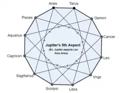 According to the Tajika System,[6] that in practice is applied more to Varshaphal (Annual Chart) or a query-chart (Horary astrology), the planetary aspect on the 5th and the 9th houses from itself is very strong, openly friendly and helpful, e.g. if the Sun is in Aries and Jupiter is in Leo both will aspect each other producing very favourable results. The aspect on the 3rd and the 11th is secretly friendly but very helpful with the former being stronger, e.g. if the Sun is in Aries and Jupiter in Gemini with both though aspecting each other the aspect of Sun will produce more favourable results than Jupiter. The aspect on the 4th and the 10th is secretly inimical, when planets forming such an aspect tend to produce bad results and cause disappointments, and on the 7th openly inimical, these aspects are unhelpful and often destructive. Tajika aspects are deemed effective within 12 degrees either side of the aspected point. This principle is followed by Western astrology. Benefic aspects cast on the 2nd and the 12th give happiness but inimical aspect on 6th, 7th and 8th and on itself cause many hardships. Aspects of partial strength are not generally taken into account.[7]