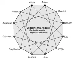 Jupiter's 5th aspect. Also, Jupiter's 9th aspect - 4 Triangles drawn in blue color