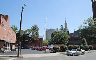 The Asylum Avenue District is centered on a stretch of Sigourney Street, between Asylum and Farmington Avenues, both major arteries leading west from downtown Hartford. Extending east and west from that road are the institutional buildings that make up the heart of Asylum Hill. The northeastern corner of the district is marked by the Asylum Hill Congregational Church, a Gothic Revival brownstone built in 1865. It is a rare example of a Congregational church designed by Patrick C. Keely, most of whose work was for the Roman Catholic Church. At the southeastern corner is the Cathedral of St. Joseph, the cathedral church of the Roman Catholic Archdiocese of Hartford. It was built in the early 1960s to a design by Eggers & Higgins in the International style, replacing a Gothic brownstone designed by Keely that was destroyed by fire.[2]