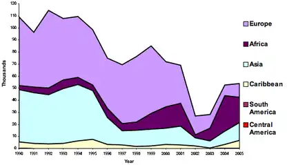 During the Cold War, and up until the mid-1990s, the majority of refugees resettled in the U.S. were people from the former-Soviet Union and Southeast Asia.[17] The most conspicuous of the latter were the refugees from Vietnam following the Vietnam War, sometimes known as "boat people". Following the end of the Cold War, the largest resettled European group were refugees from the Balkans, primarily Serbs, from Kosovo, Bosnia and Croatia.[17] In the 1990s and 2000s, the proportion of Africans rose in the annual resettled population, as many people fled various ongoing conflicts.[17]